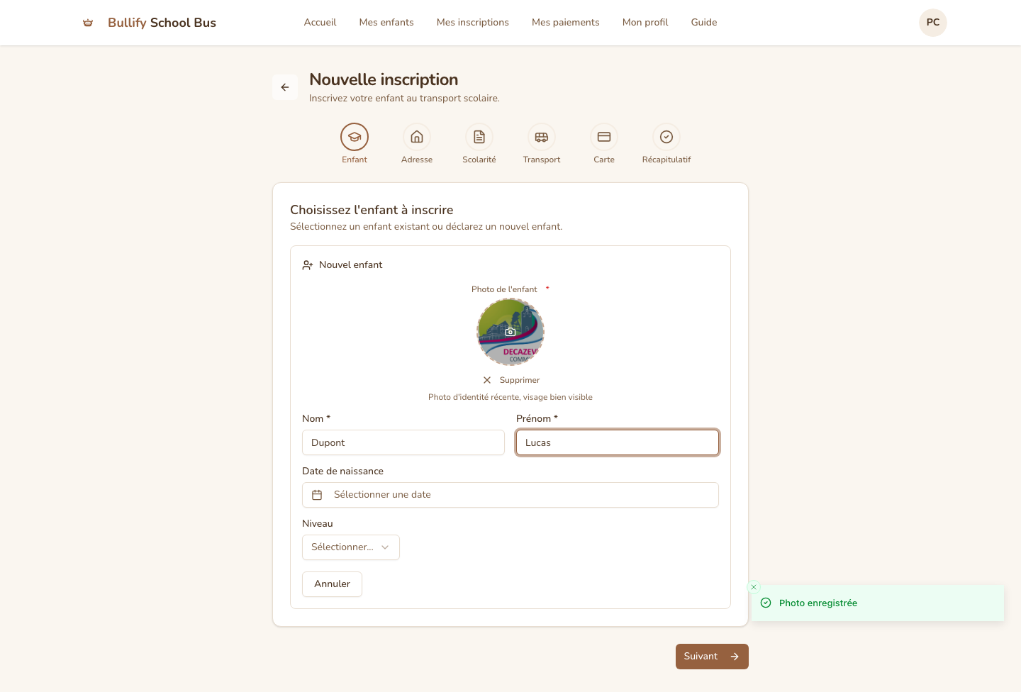 Le formulaire « Déclarer un nouvel enfant » — prénom, nom, date de naissance, niveau scolaire et photo