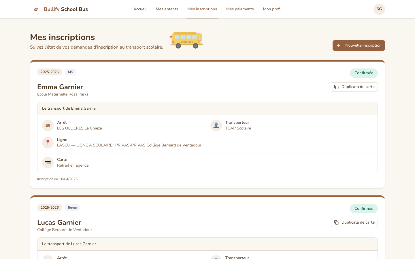 Si vous avez plusieurs enfants, vous n'avez besoin que d'un seul compte parent. Vous pourrez inscrire chaque enfant indépendamment depuis votre espace.